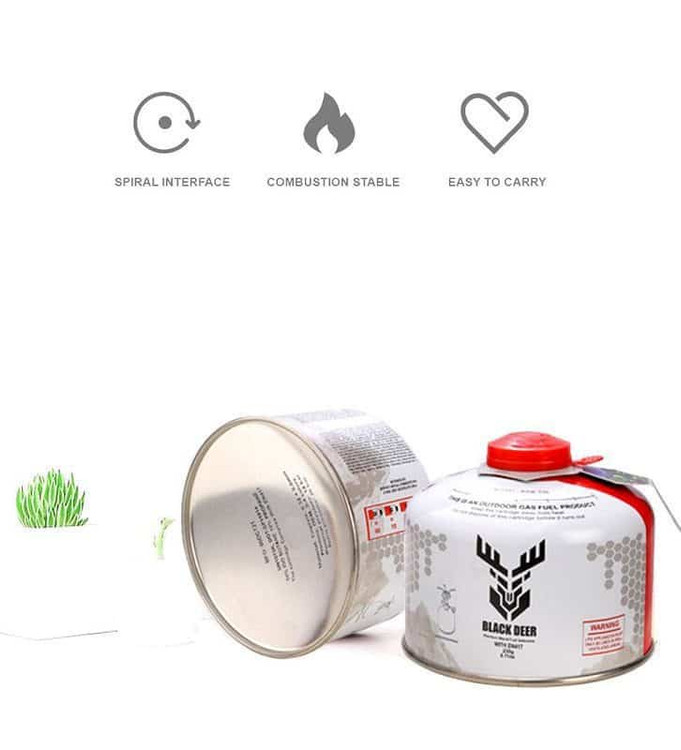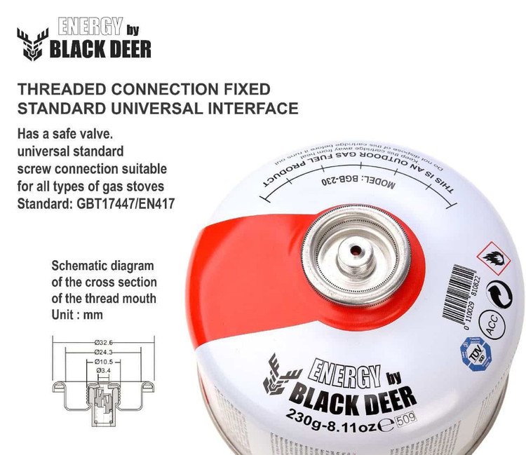 کپسول گاز 230 گرمی black deer با اتصال رزوه ای به سرشعله متصل شده و همچنین دارای استاندارد GBT17447/EN417 INTERFACE هست. وزن کپسول به طور کلی 375 گرم می باشد.